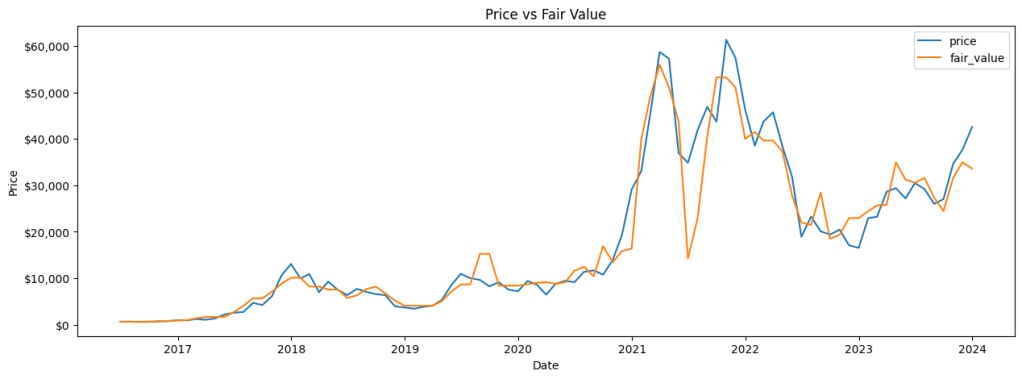 This is a proprietary BTC Prediction model that evaluates the current market for BTC and predicts whether it is fairly valued or not.