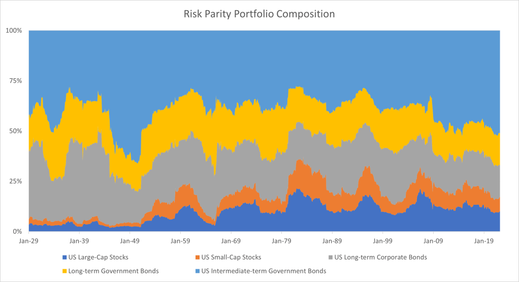 The above chart shows the weights of a 5 asset Risk Parity portfolio using a trailing 36 month standard deviation as a measurement of risk from 1929 through 2022. In the above horserace, the unlevered Risk Parity portfolio is in green. The assets in the portfolio are US Large-Cap Stocks, US Small-Cap Stocks, US Long-term (20-Year) Corporate Bonds, US Long-term (20-Year) Government Bonds, and US Intermediate-term (5-Year) Government Bonds. The composition fluctuates over the years as the relative risk of each of the 5 asset classes changes. Generally speaking, the assets that are riskier have less of a weight in the portfolio, which is why you seem the portfolio dominated by bonds.