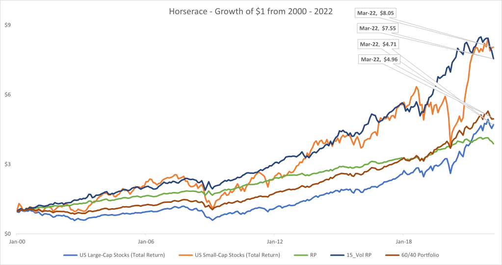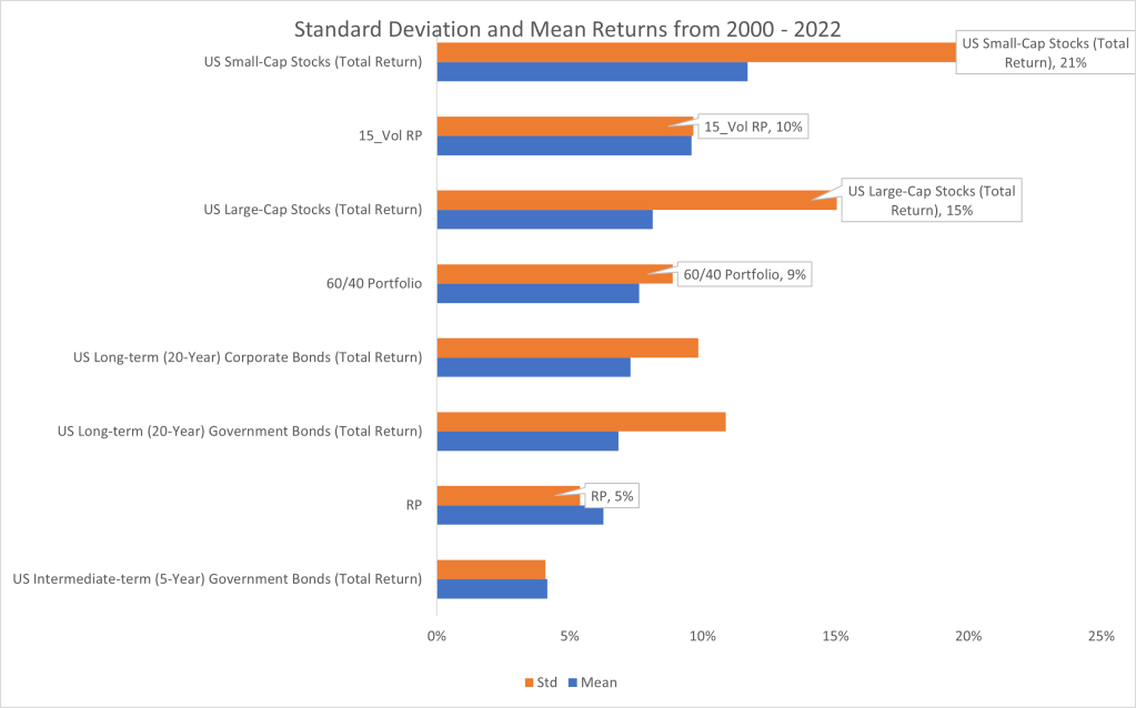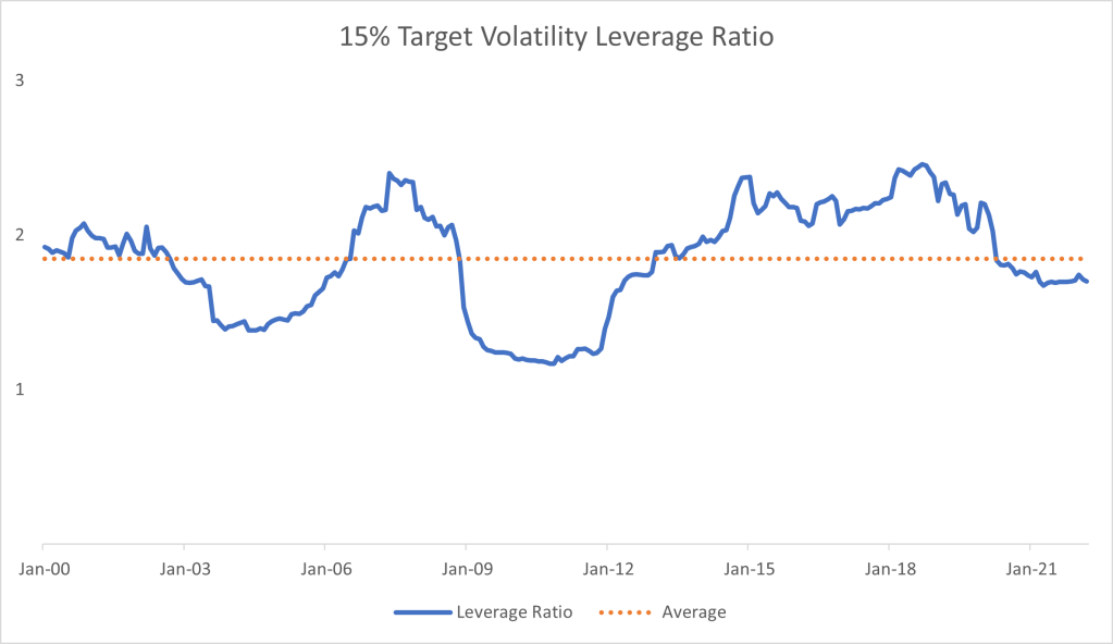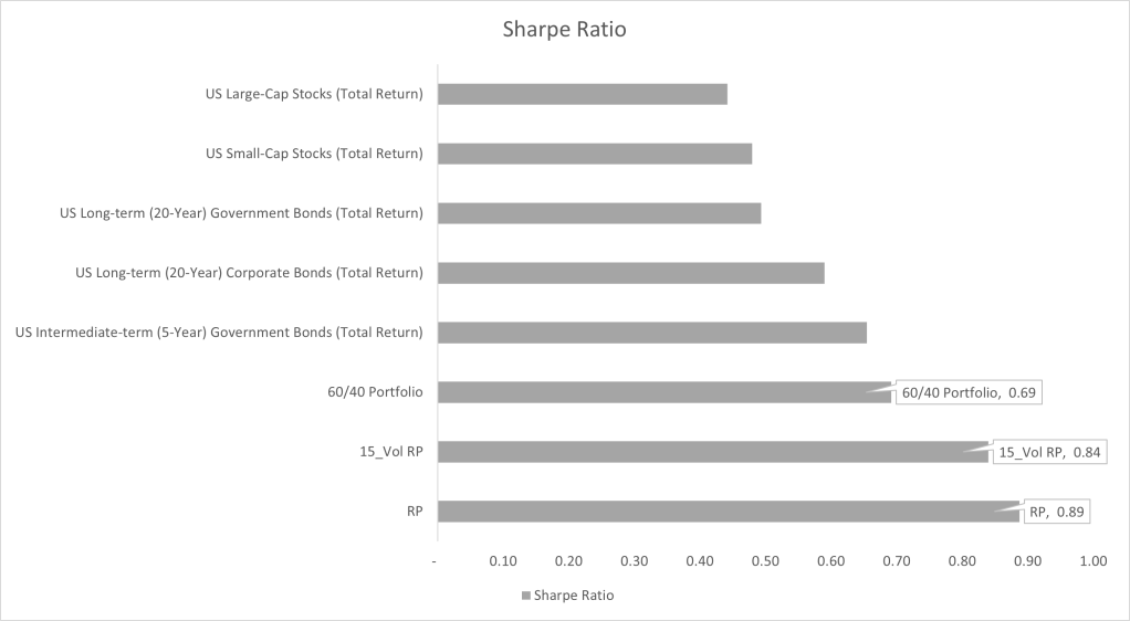 Risk Parity tends to perform better than some of the other common types of investments (For example, in the gallery below, Sharpe ratio of .89 for an unlevered Risk Parity portfolio and .69 Sharpe ratio for the 60/40 bond portfolio). An average leverage ratio for a target 15% volatility Sharpe portfolio is on average around 2X using the 5 assets above from the years 2000 through 2022.