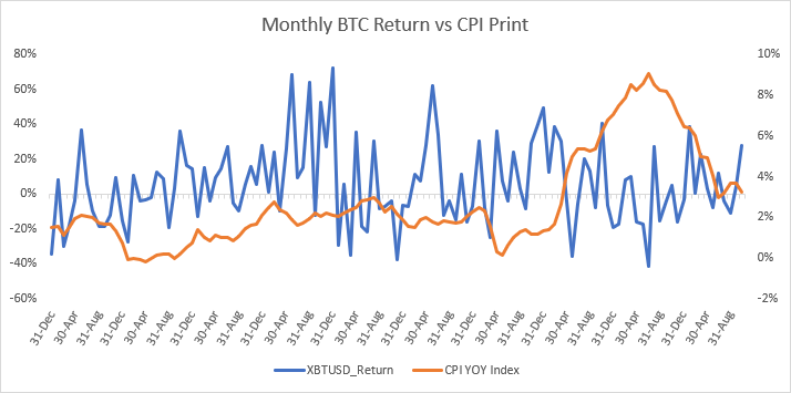 Examining the table above shows the monthly returns of Bitcoin plotted against the monthly CPI print. In order for Bitcoin to be a proper hedge against inflation we would expect there to be a high degree of co-movement between inflation and the returns on Bitcoin. When inflation increases we would expect returns on Bitcoin to increase thus acting as a hedge. In looking at the chart, it is hard to really see the correlation but it certainly looks like at least in the latter part of the chart (2021 – 2023) this is certainly not the case as the orange line is increasing and the returns on BTC vary wildly and are mostly negative. This was the period where Bitcoin dropped from a high of ~ $60k to less than $20k, precisely when inflation was at it’s highest and the “hedginess” of the position was most needed.